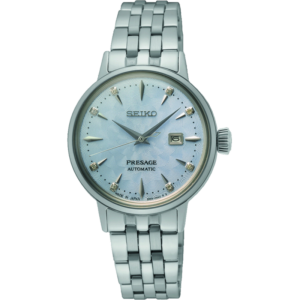 Il Presage Cocktail SRE007J1 si ispira al cocktail Sky Diving, la cui texture leggera del quadrante richiama l’azzurro del cielo. Il quadrante è sottile e delicato con una finitura ordinata. Diversi strati di un rivestimento trasparente vengono applicati al quadrante prima di essere levigati per un effetto abbagliante. Otto diamanti posti a livello degli indici aggiungono un tocco di lusso e glamour al polso.