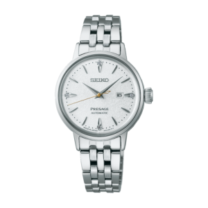 La collezione Presage Cocktail ha il fascino di identificare una linea di orologi ispirati al piacere di gustare un bel cocktail. Lo scintillante quadrante a raggi di sole dell’ SRPG23J1, ispirato al cocktail Martini bianco, è esaltato dai sette strati di vernice e dalla chiarezza degli indici in rilievo.