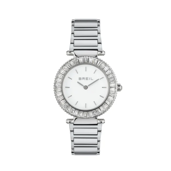 L’orologio da donna Pivot è in acciaio lucido e strizza l’occhio ai modelli vintage per le linee e il design. La cassa tonda è impreziosita dalla lunetta dentellata con lucenti cristalli taglio baguette e dai cristalli agli indici, che incorniciano con eleganza il quadrante bianco. Classico e glam al tempo stesso, perfetto con ogni look.